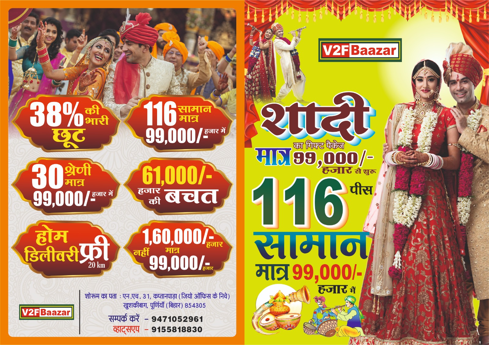 V2FBaazar is a growing home solutions brand committed to delivering high-quality furniture and home appliances across Bihar. We specialize in premium palang, refrigerators, washing machines, Godrej almirahs, kitchen appliances, and a wide range of household essentials.